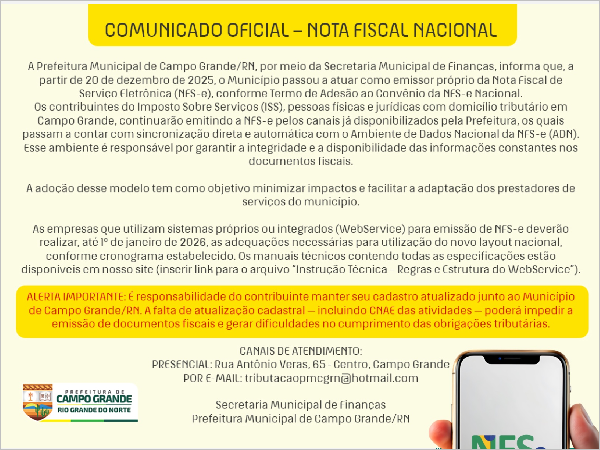 CHEFE DE GABINETE CONTROLADORIA GERAL DO MUNICÍPIO FUNDO MUNICIPAL DE ASSISTÊNCIA SOCIAL DE CAMPO GRANDE FUNDO MUNICIPAL DE SAÚDE DE CAMPO GRANDE-RN GABINETE DO PREFEITO LICITAÇÃO MUNICIPIO DE CAMPO GRANDE SECRETARIA DE PLANEJAMENTO, ORÇAMENTO E GESTÃO SECRETARIA DE TRANSPORTES SECRETARIA MUNICIPAL DA ADMINISTRAÇÃO E RECURSOS HUMANOS SECRETARIA MUNICIPAL DA AGRICULTURA, MEIO AMBIENTE RECURSOS HÍDRICOS E ABASTECIMENTO SECRETARIA MUNICIPAL DA EDUCAÇÃO, ESPORTE, CULTURA E LAZER SECRETÁRIA MUNICIPAL DE ASSISTÊNCIA SOCIAL SECRETARIA MUNICIPAL DE DESENVOLVIMENTO ECONOMICO SECRETARIA MUNICIPAL DE FINANÇAS E TRIBUTAÇÃO SECRETARIA MUNICIPAL DE OBRAS, URBANISMO E SERVIÇOS PUBLICOS SECRETARIA MUNICIPAL DE SAÚDE SETOR DE LICITAÇÃO TESOURARIA
